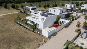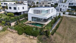 Dům do Dolních Počernic navržen dle místa. Otevřen k pohybu Slunce a výhledu, uzavřen ke komunikaci. Původně hranolový objekt tak byl osekán a postupně utvářen zkoumáním charakteru parcely. V přízemí obývací prostor, technické zázemí, hygiena, terasa, pracovna. V patře ložnice, šatny, hygiena a druhá terasa. Jezírko na zahradě. Nábytek na míru. Omítka, geometrie, světlo a stín.